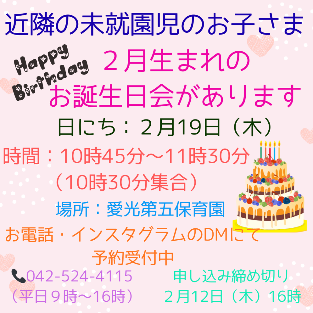 2月生まれの未就園児のお子さまを対象に、お誕生日会へのお誘いです。